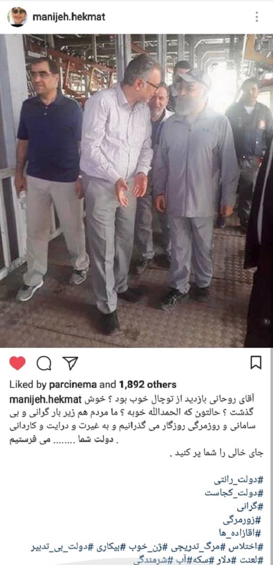 منیژه حکمت در واکنشی تند به توچال رفتن رییس جمهور در این برهه حساس اقتصادی و معیشتی مردم در اینستاگرامش نوشت.