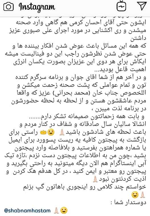 همچنین شاهرخ استخری در اینستاگرامش نوشت: سلام عید همگی مبارک... دیگه از وقتی پناه خانم پیج خودشون رو دارن مثل اینکه من نمیتونم هیچ خبر جدیدی بهتون بدم چون اونجا زودتر لو میره...