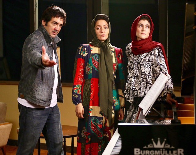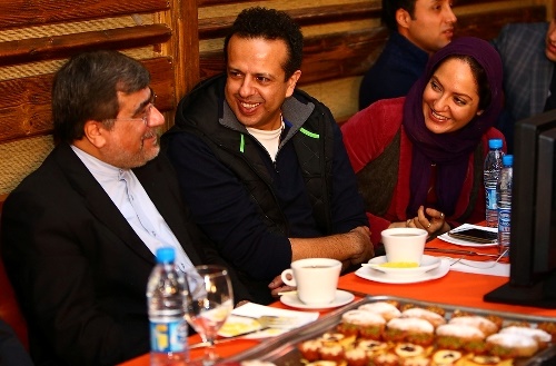 مهناز افشار و سامان مقدم در کنار علی جنتی وزیر سابق ارشاد در پشت صحنه «نهنگ عنبر»