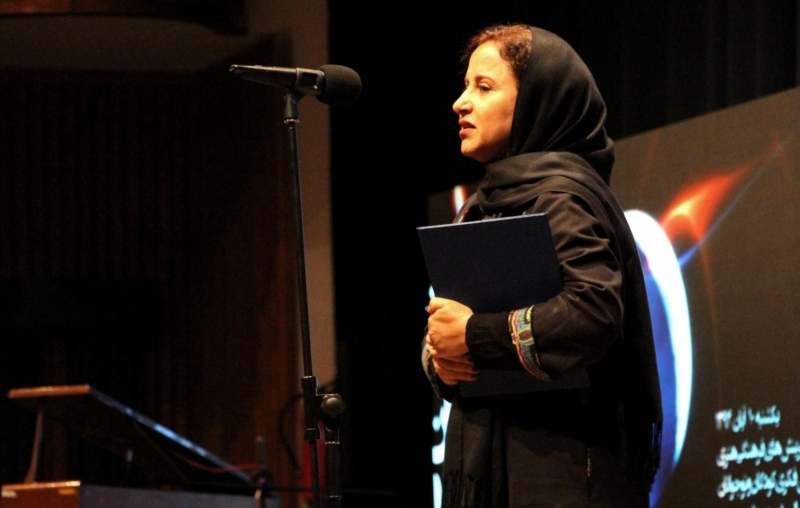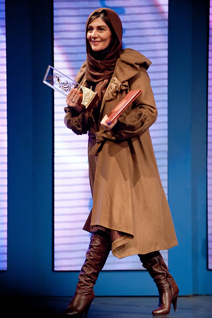 هنگامه قاضیانی در حال دریافت سیمرغ بلورین از سی امین دوره جشنواره فیلم فجر