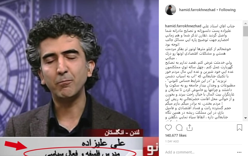 حمید فرخ نژاد در پستی اینستاگرامی به صحبت های علی علیزاده که او را نصیحت کرده بود، واکنش نشان داد.