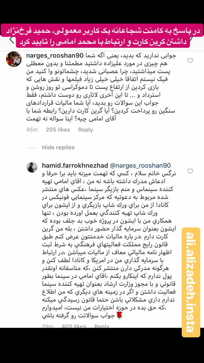همچنین فرخ نژاد در کامنتی در پاسخ به یک کاربر داشتن گرین کارت و ارتباط به محمد امامی را تایید کرد: