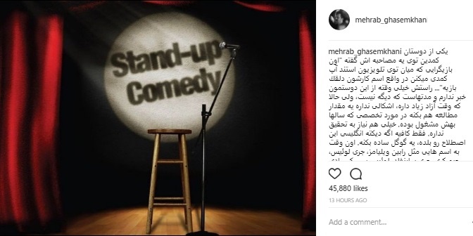 راستش خیلی وقته از این دوستمون خبر ندارم و مدتهاست که دیگه نیست، ولی حالا که وقت آزاد زیاد داره، اشکالی نداره یه مقدار مطالعه هم بکنه در مورد تخصصی که سالها بهش مشغول بوده. خیلی هم نیاز به تحقیق نداره. فقط کافیه اگه دیکته انگلیسی این اصطلاح رو بلده، یه گوگل ساده بکنه. اون وقت به اسمهایی مثل رابین ویلیامز، جری لوئیس، جیم کری، جری ساینفلد، لوئیس سی. کی، ادی مورفی، وودی آلن، استیو مارتین و یه سری های دیگه برمیخوره که استند آپ کمدی هم میکردن.»