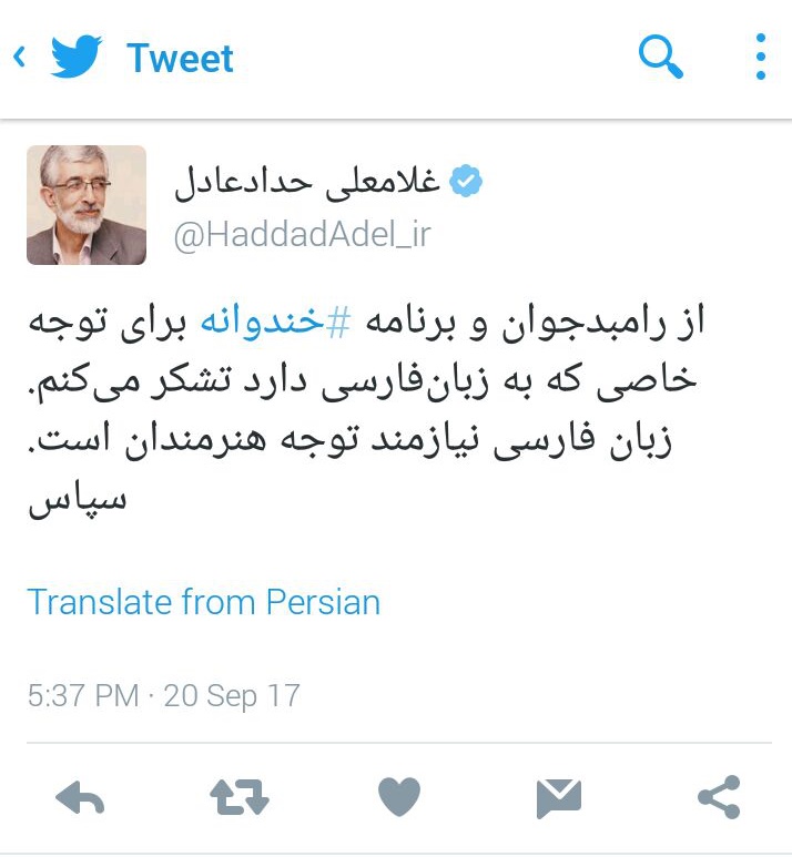 غلامعلی حدادعادل رییس فرهنگستان زبان فارسی در توییتی ضمن تشکر از رامبد جوان برای تولید برنامه «خندوانه» نوشت: «از رامبدجوان و برنامه خندوانه برای توجه خاصی که به زبانفارسی دارد تشکر میکنم. زبان فارسی نیازمند توجه هنرمندان است. سپاس»