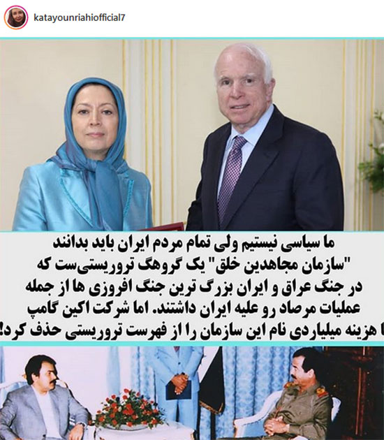 کتایون ریاحی با انتشار این عکس در اینستاگرامش نوشت: خدا را شاکرم که حافظه تاریخی هموطنانم در این مورد بسیار خوب کار می کند، حنای مریم خائنی که هفده هزار نفر از هموطنانش را شهید کرد در نزد ایرانیان دلیر رنگی ندارد. خداوند همه شما را به راه راست هدایت کند.